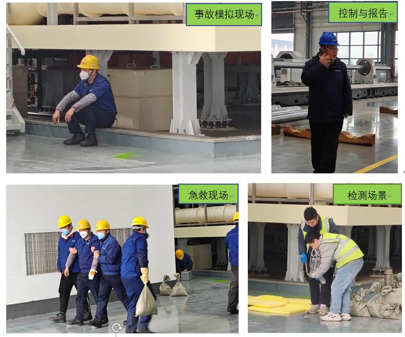 特種缸車間作為本次事故模擬地點、公司根據應急救援和措施展開系列現場搶險與報告、及時聯系高新區事故接警、做好企業警戒及響應和搶險行動、配合消防組織和檢測機構展開事故處置,并完成應急和善后行動。